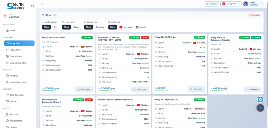 Để phục vụ đa dạng nhu cầu của dân làm MMO, Sieuthiseeding.vn cung cấp đầy đủ hai hệ sinh thái Proxy mạnh mẽ nhất hiện nay: